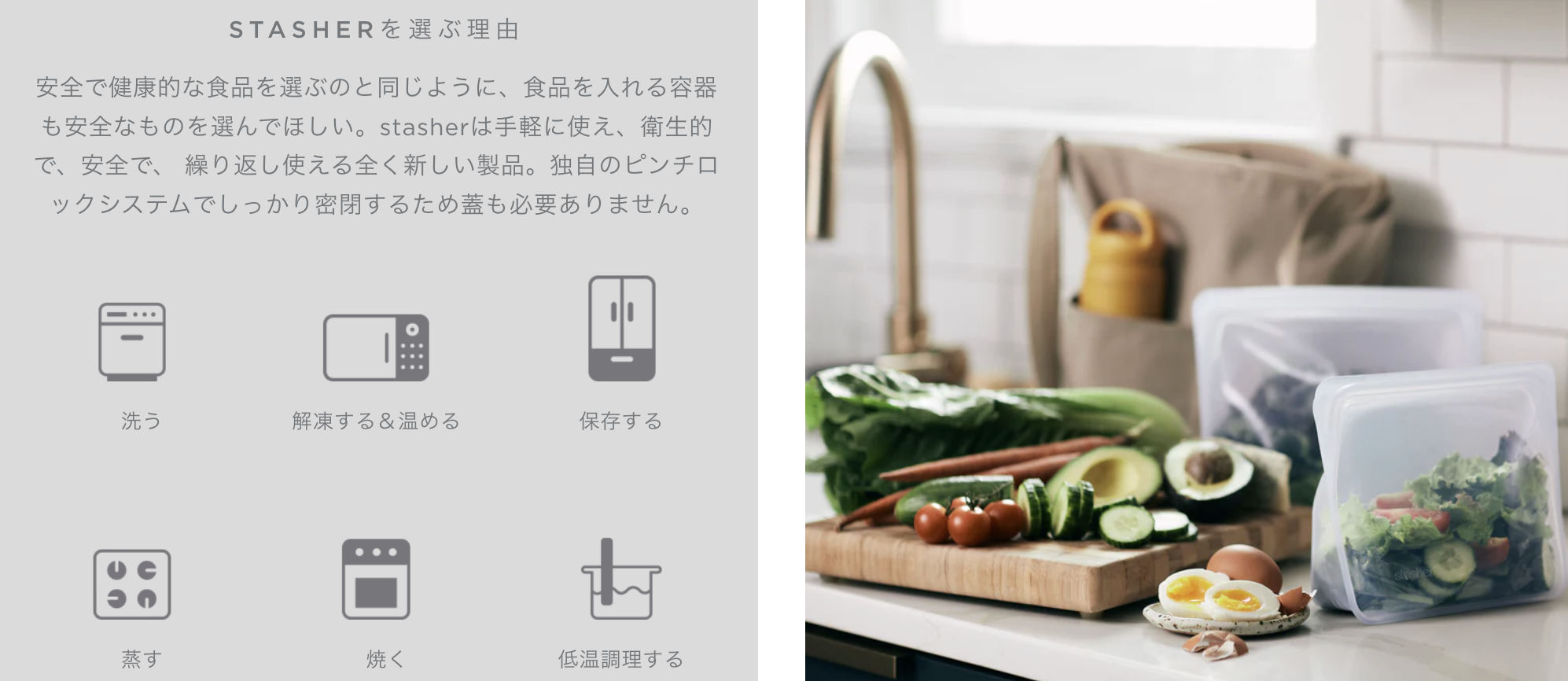 暮らしをやさしく変える一歩。 あなたの手に、ひとにも地球にもやさしい「stasher(スタッシャー)」を。