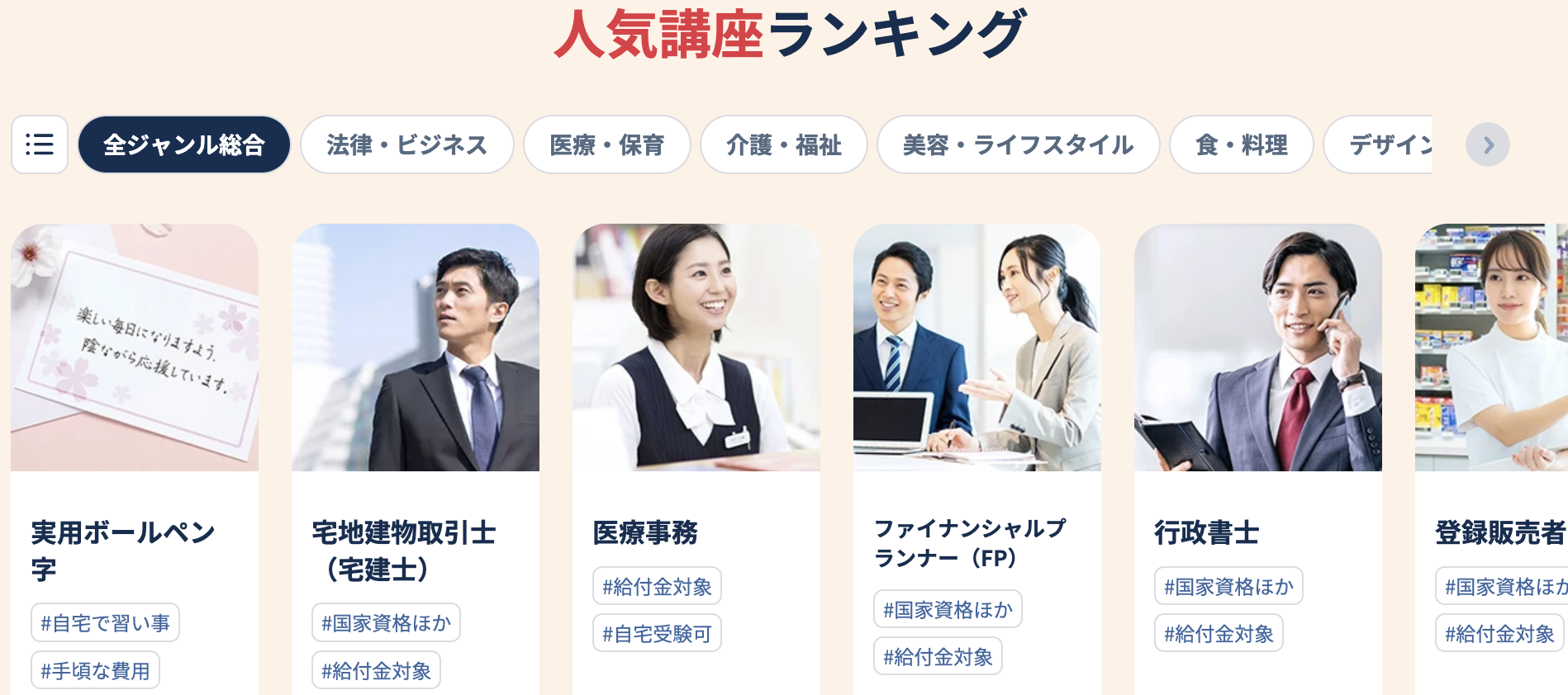 • 資格系:医療事務・宅建士・ファイナンシャルプランナー・保育士など