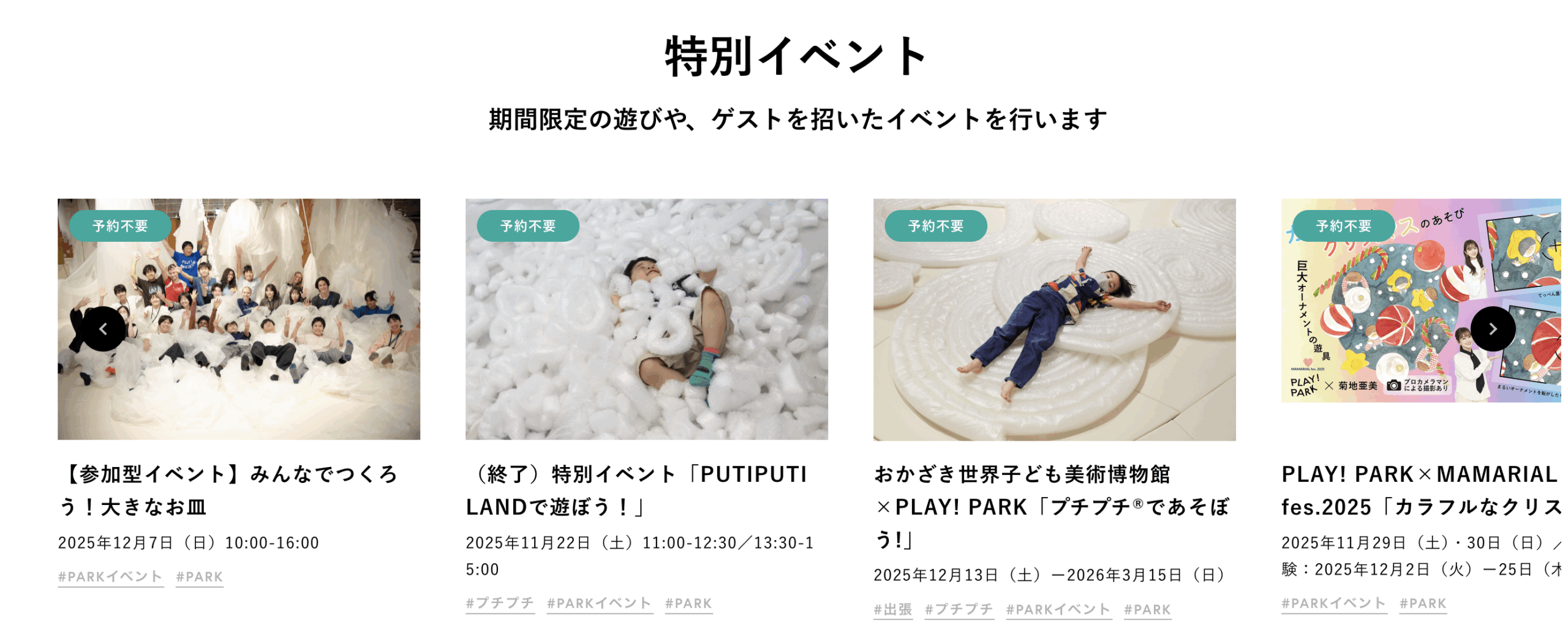 「今日は何をしようか迷ってしまう」という場合でも安心です。PLAY!PARKでは、毎日多彩なワークショップが開催されています。