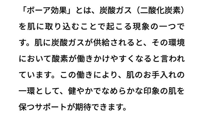炭酸が肌に触れることで血行が促進され、皮膚の代謝が整うことで毛穴の開き・黒ずみの目立ちが改善されやすくなります。