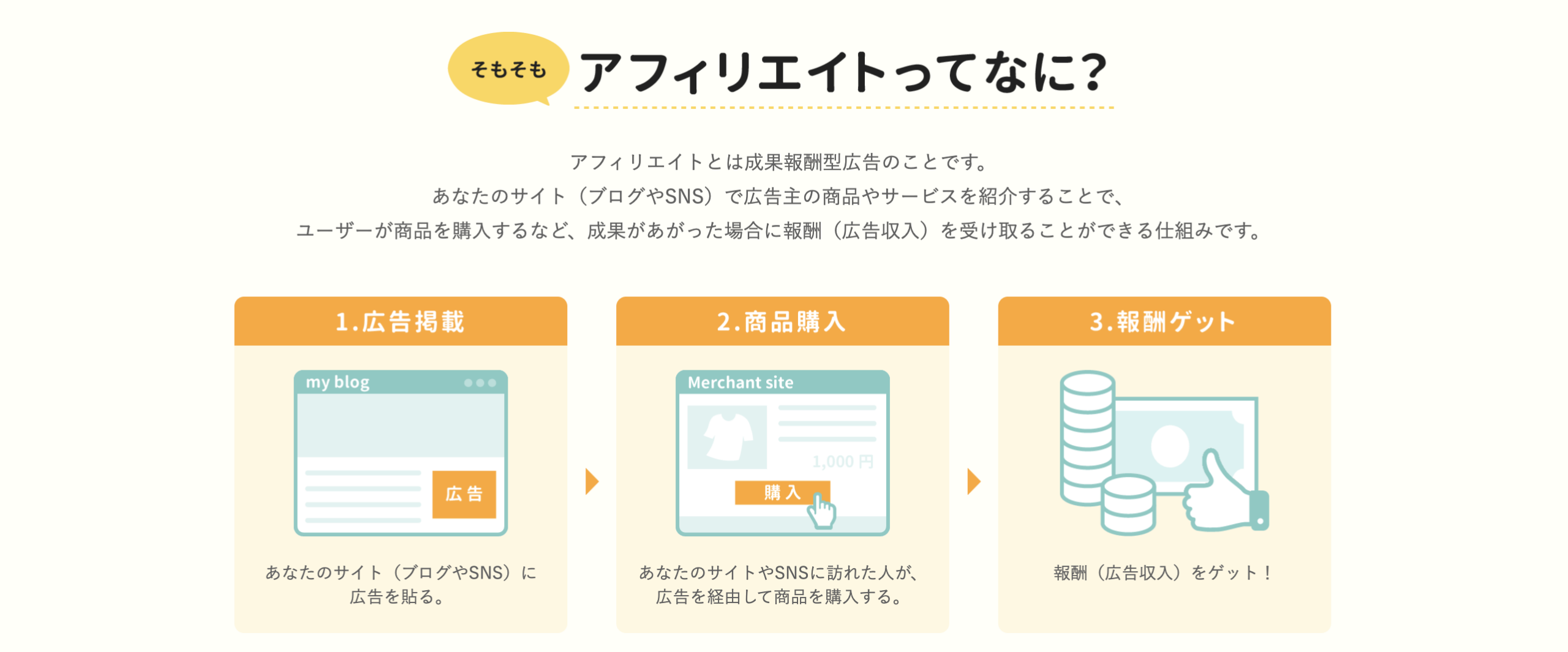 掲載可能な広告案件を選び、成果に応じて報酬を得る仕組み。