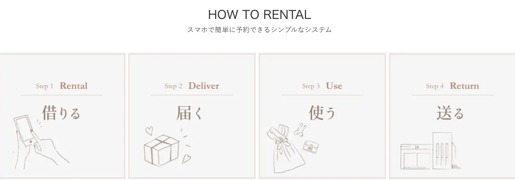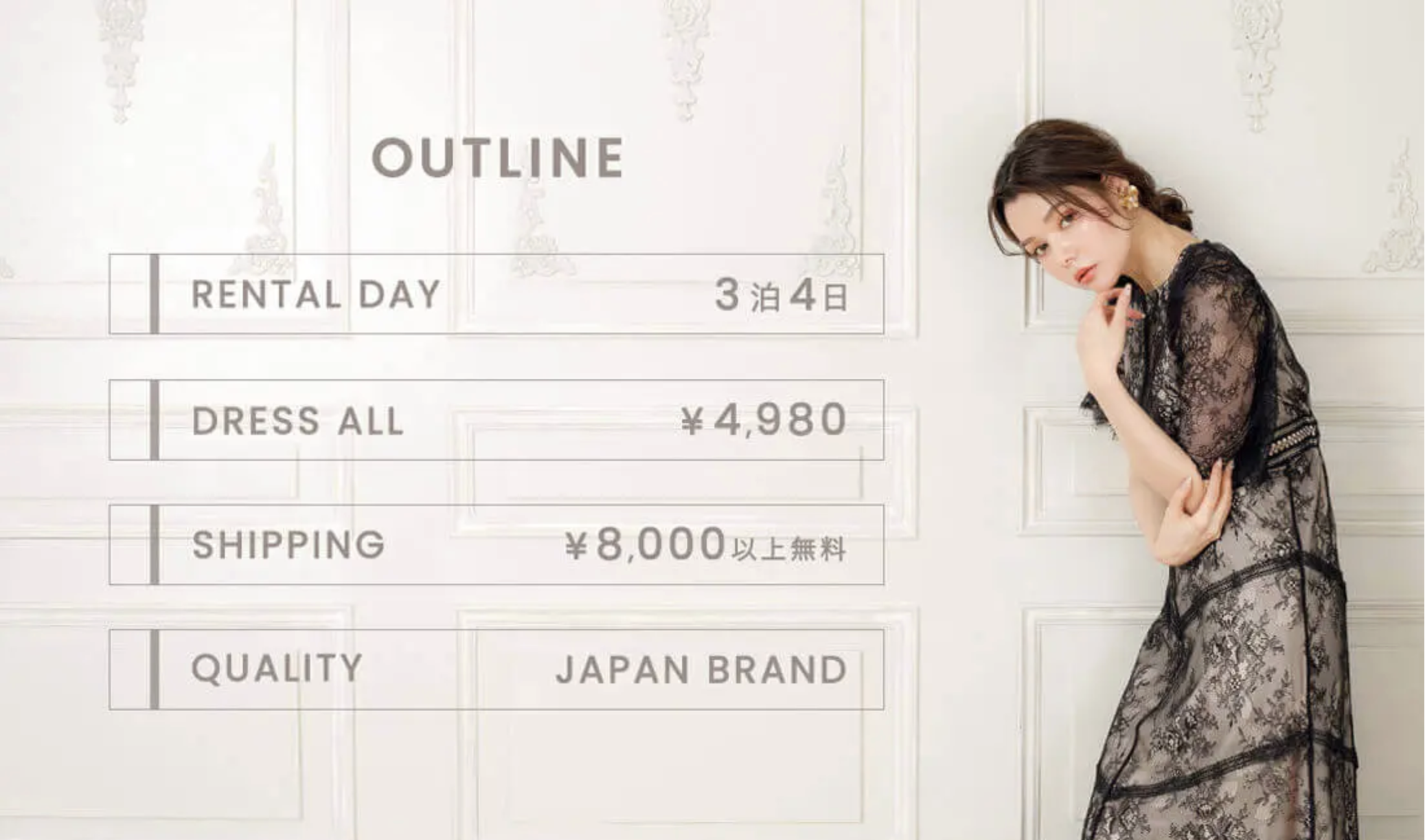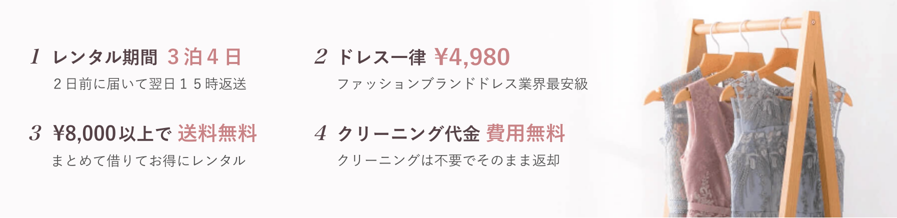 店頭価格15,000円〜25,000円相当の国内ブランドドレスを採用しています。 - レンタル日程は3泊4日のみ