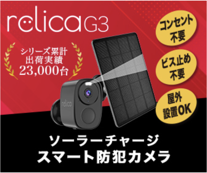 「relica G3」は、ソーラーパネル搭載の次世代防犯カメラ。