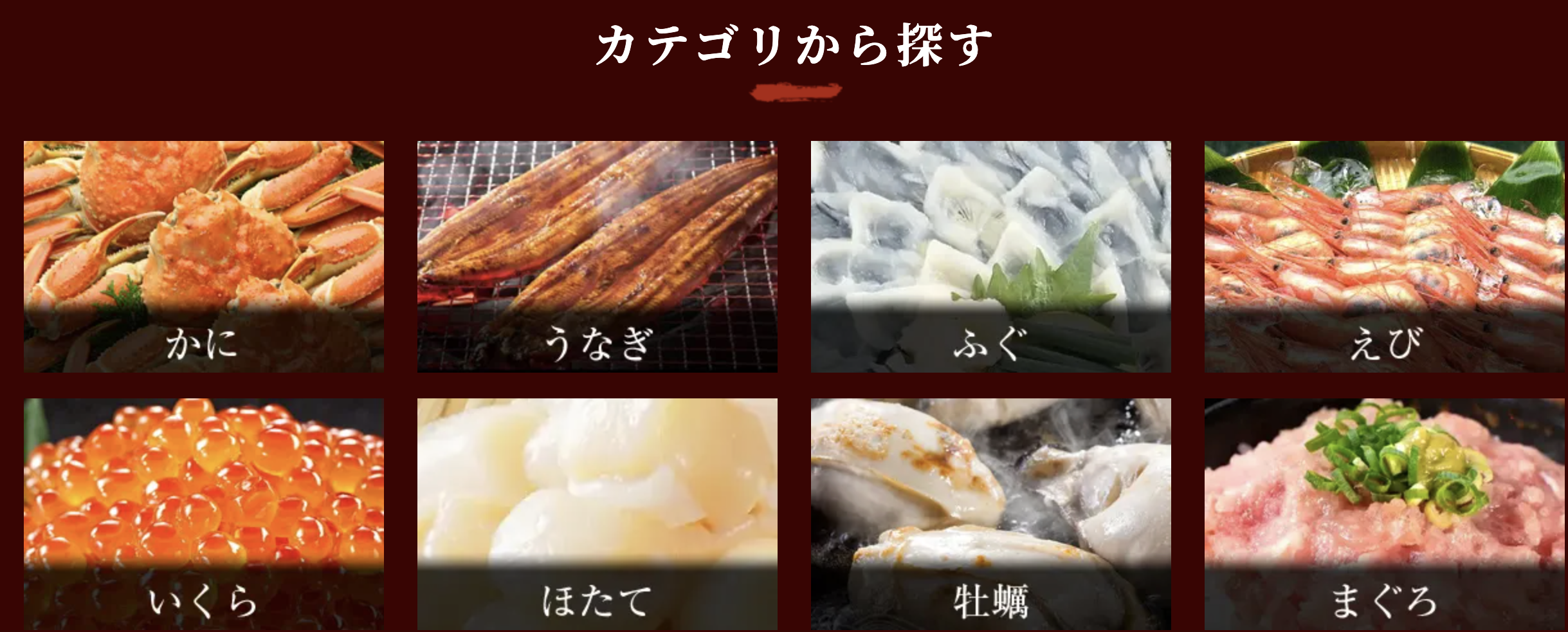 定番のカニ商品に加え、エビ・ホタテ・ウナギ・海鮮セットなど、用途に応じた商品を展開。