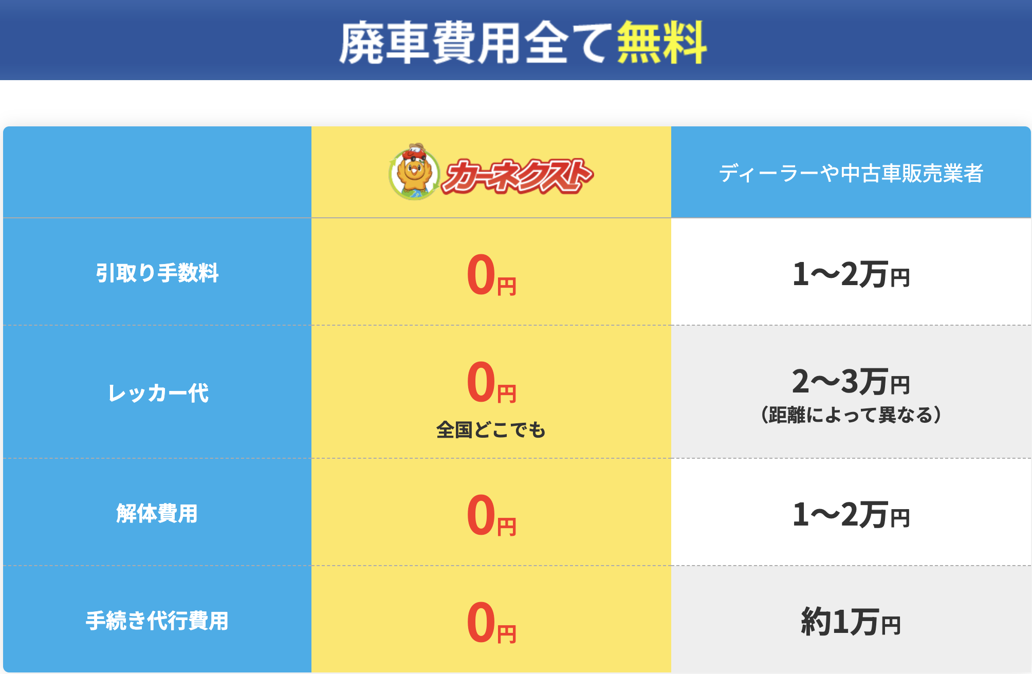 「廃車にはお金がかかる」と思っている方も多いですが、カーネクストでは廃車費用・引取り費用・手続き費用がすべて無料です。