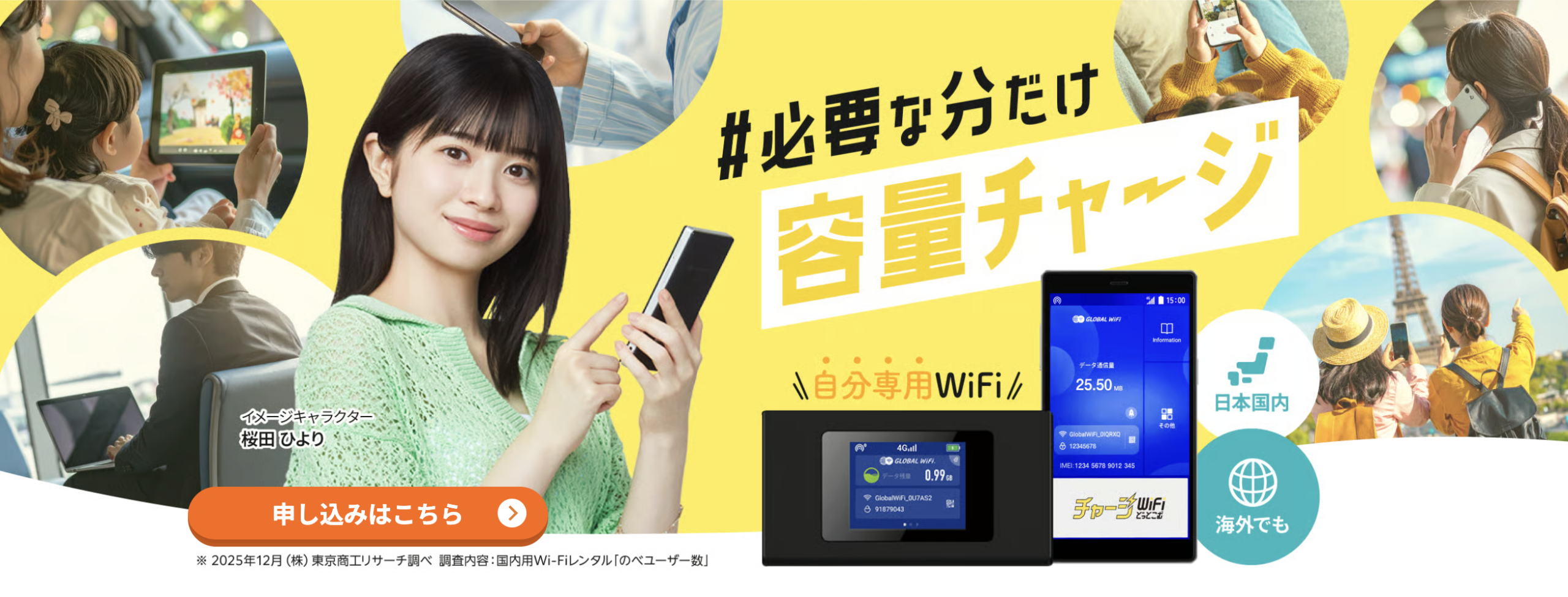そんな方に注目されているのが、必要なときだけ容量をチャージして使える「チャージWiFiどっとこむ」です。月額契約にしばられにくく、自分のペースで使いやすい仕組みが魅力で、無駄な固定費をできるだけ抑えたい方にも向いています。